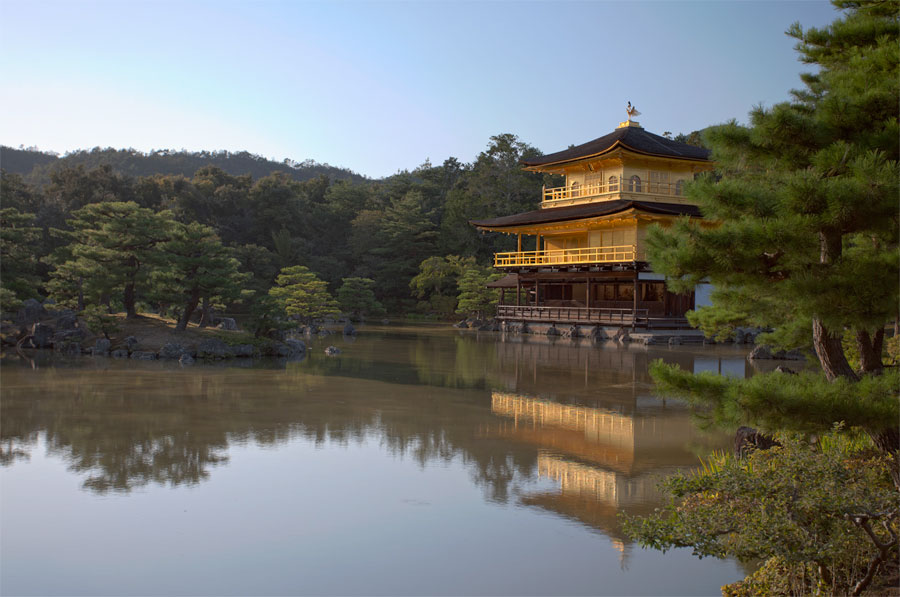 A Kyoto, ancienne capitale impériale, le pavillon d’or, ou «Kinkakuji», juste au coucher du soleil. Le soleil de face, le reflet dans l’eau (on notera la position du batiment au 1/3 droit de la photo ).